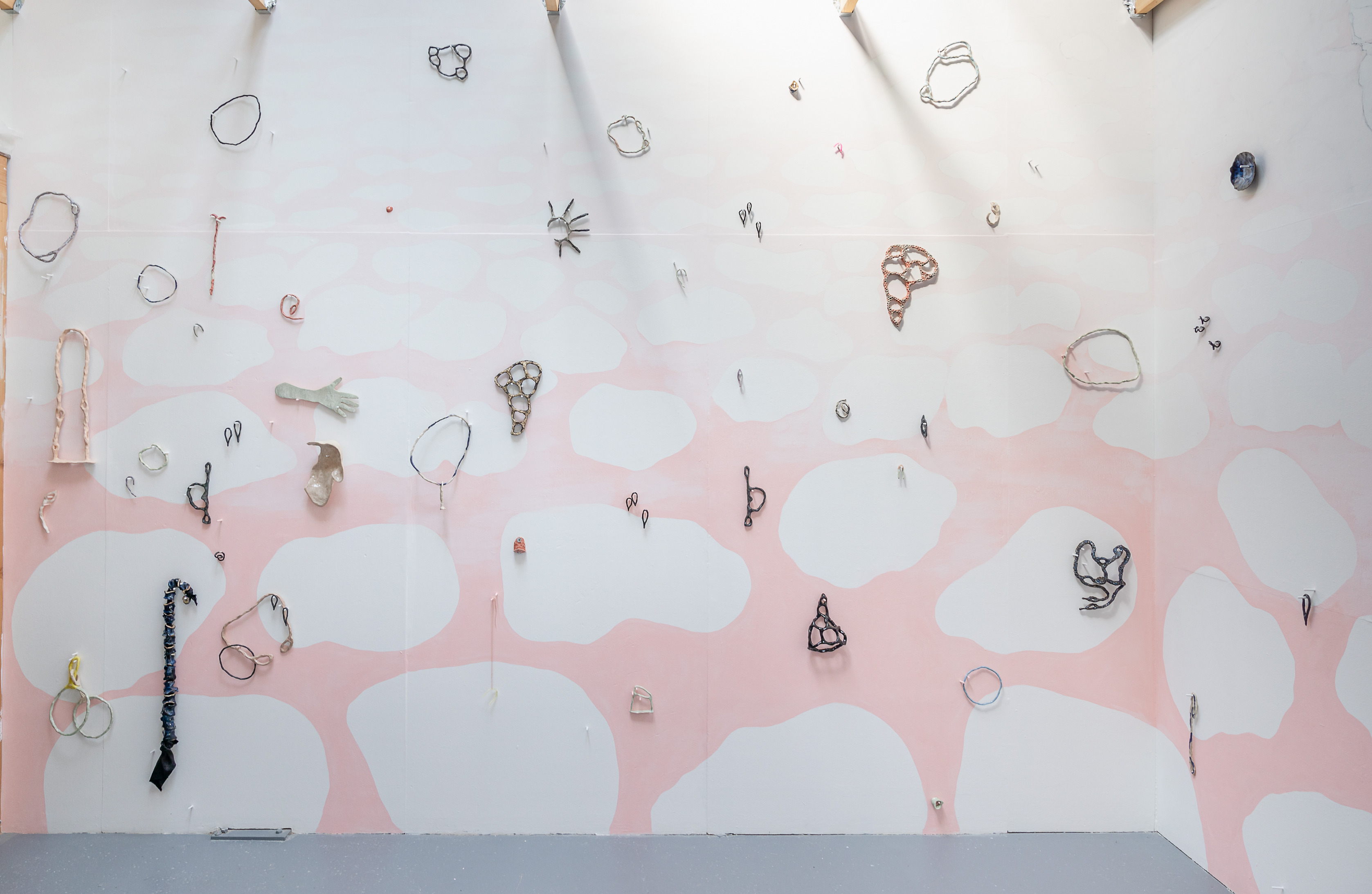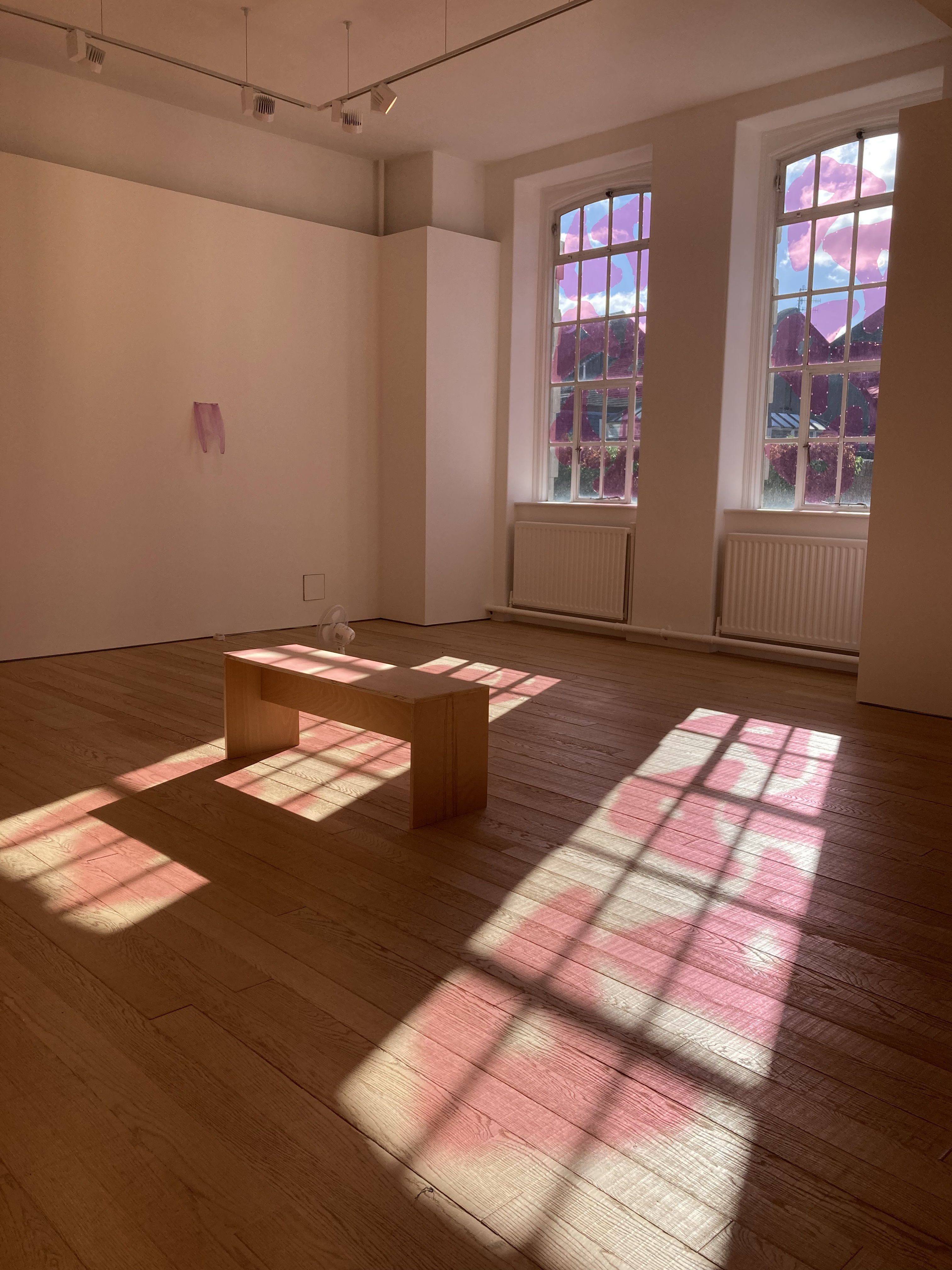 Move through me (proposal for stained glass) appeared as a provisional installation in the gallery windows, sporadically casting its subtle pink form across the floor and walls as the sunlight came and went.